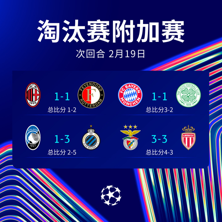 至此,本赛季欧冠淘汰赛附加赛次回合的前四场比赛相继结束,拜仁1-1绝平凯尔特人,本菲卡3-3战平摩纳哥。